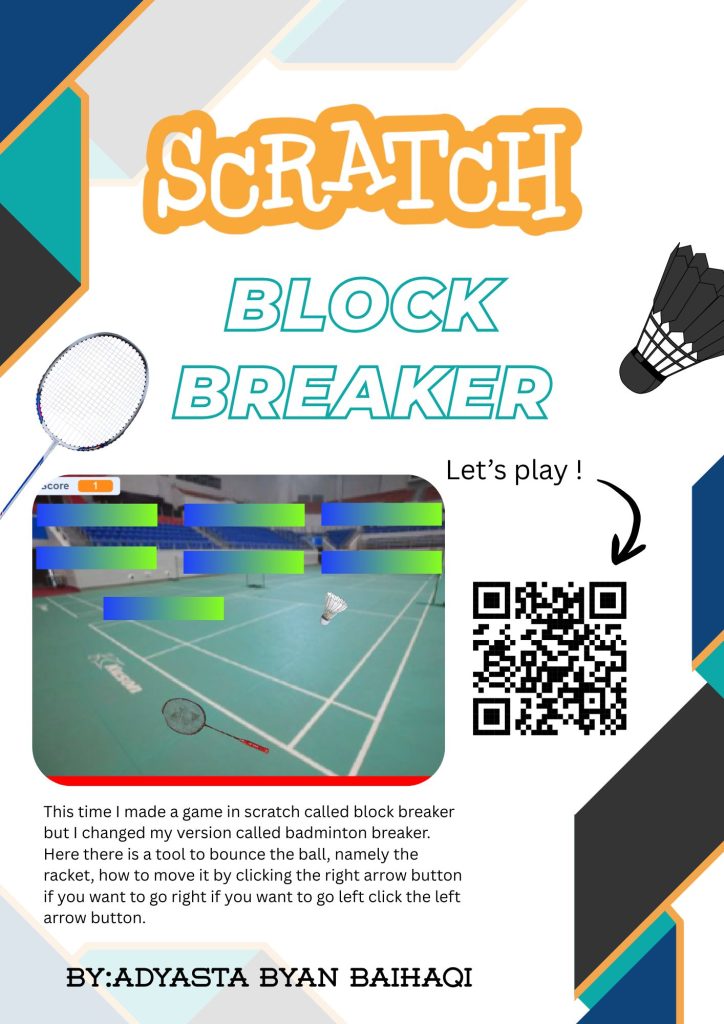 This time I made a game in scratch called block breaker but I changed my version called badminton breaker. Here there is a tool to bounce the ball, namely the racket, how to move it by clicking the right arrow button if you want to go right if you want to go left click the left arrow button. So we have to destroy all the blocks if you want to win using a badminton racket and using a badminton ball, it’s fun, right? Come on, let’s play!