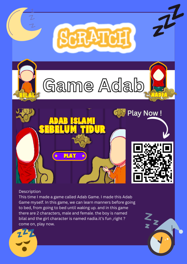 This time I made a game called Adab Game. I made this Adab Game myself. In this game, we can learn manners before going to bed, from going to bed until waking up. and in this game there are 2 characters, male and female. the boy is named bilal and the girl character is named nadia. when you want to play this game there will be an animation that says idn super kids and after that you can click the play button and you can choose a character and after that there is a right arrow button to go to the next part, the left one goes back to the previous one.