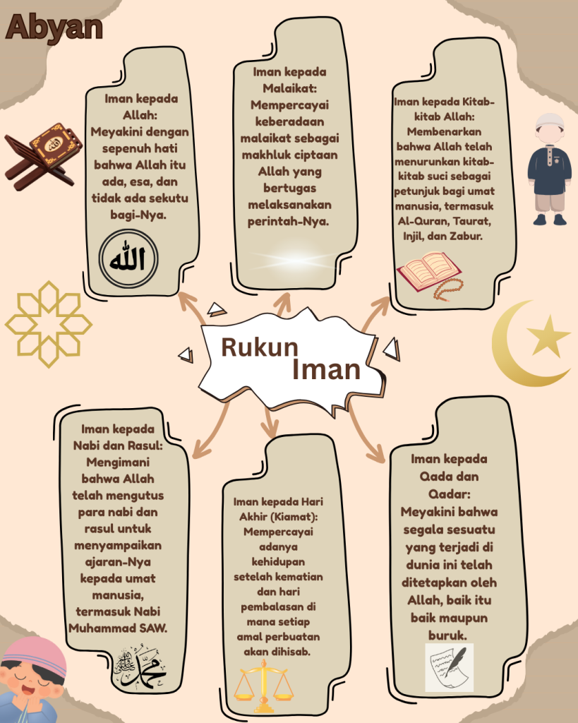This time I made a poster about the pillars of faith. as we know there are six pillars of faith 1. faith in Allah 2. faith in angels 3. faith in the book 4. faith in the apostles 5. faith in the last day 6. faith in qada and qadar