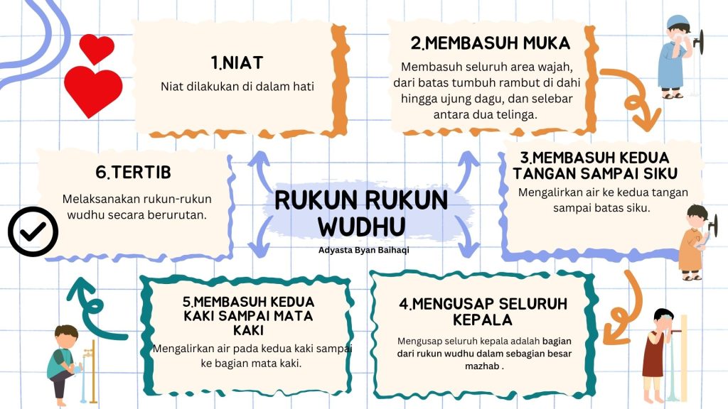 Assalamualaikum wr.wb hello everyone today i made a poster the name poster is rukun rukun wudhu in here there is 6 point you can see all point.the first is 1. intention and the second is 2. washing the face 3. washing both hands up to the elbows and 4. wiping the whole head 5. washing both feet up to the ankles the last is 6. orderly.